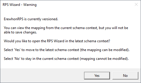 If the RPS mapping is currently versioned and you are in the current schema context, the message box shown in the following image is then displayed.