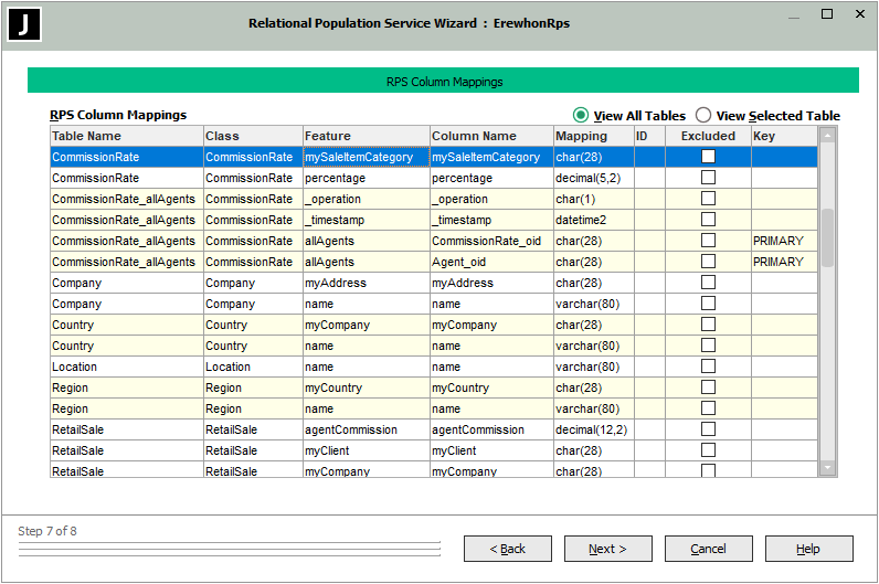 By default, the RPS Column Mappings sheet displays all tables in the RPS mapping.