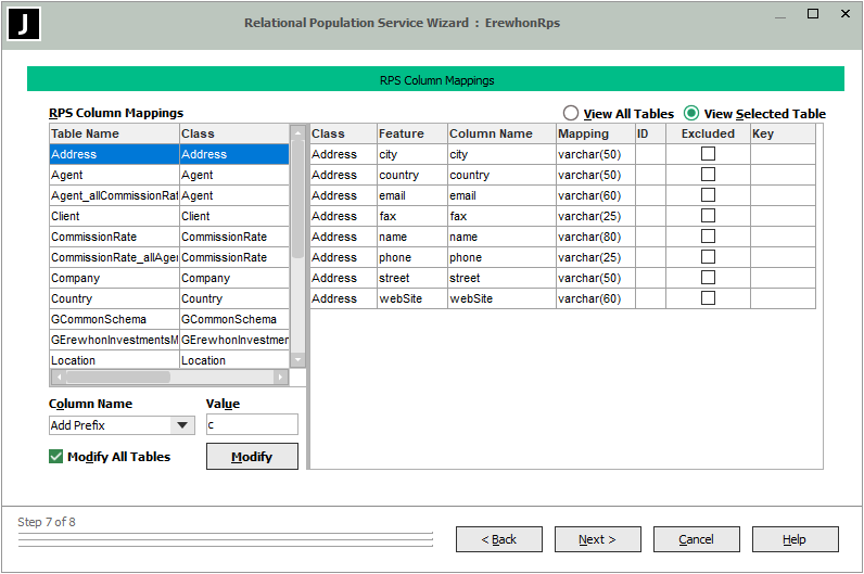 1. If you do not want the prefix or suffix to apply to all tables in the RPS mapping, uncheck the Modify All Tables check box. (A prefix or suffix value applies to all tables by default.)