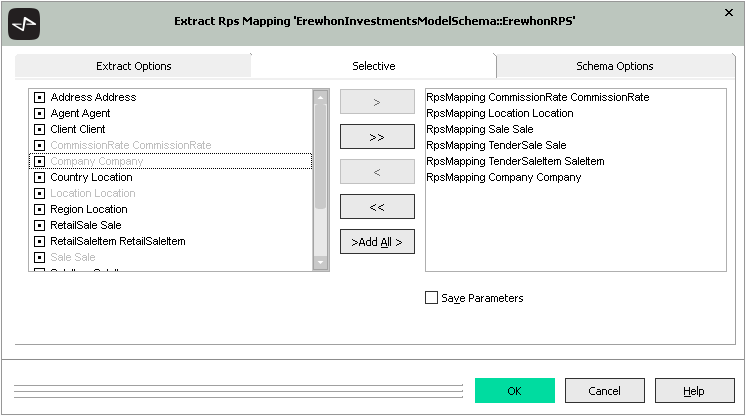 The Selective sheet enables you to specify selected class maps that are to be extracted from your RPS mapping. (For details about using Schema Options sheet, see "Extracting an RPS Mapping", earlier in this chapter.)