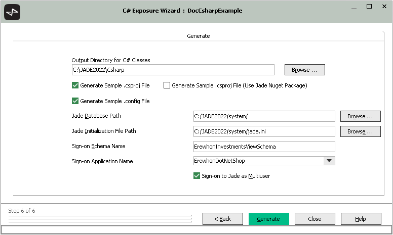 Click the Generate button to initiate the generating of a C# class for each exposed Jade class and optionally the .config and .csproj files.