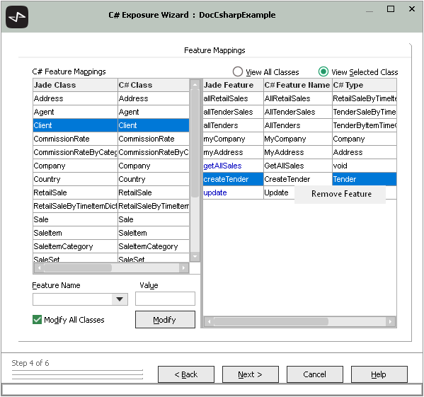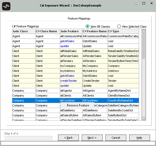 To remove a selected feature from the C# exposure, right‑click on that row and then select the Remove Feature command from the popup menu that is displayed.