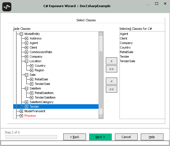 Select a superclass in the Jade Classes list box and then click the >> button, to include the selected class and all of its subclasses in the C# exposure.