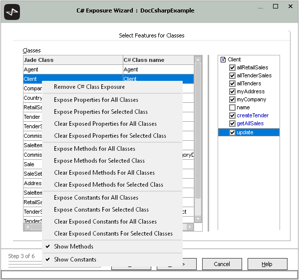 The Select Features for Classes sheet of the C# Exposure Wizard enables you to select the class features (properties and optionally methods and constants) that are included in the exposure.