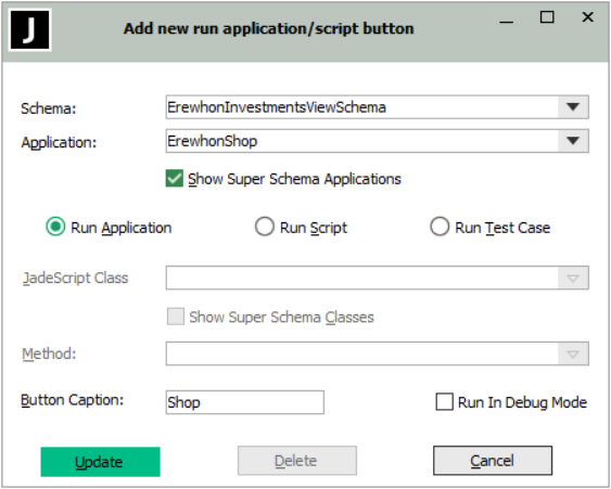 Run Script, if you want to add all JadeScript classes for the selected schema to the JadeScript Class combo box.
