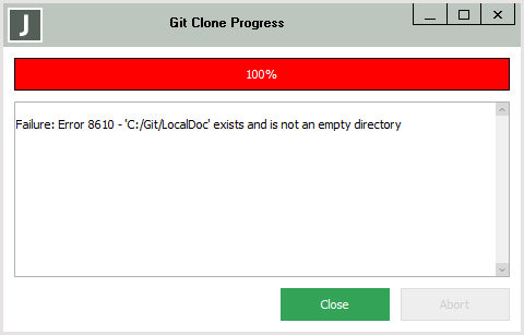 If an error is detected (for example, the specified local path already contains data), a message box like that shown in the following image is displayed.