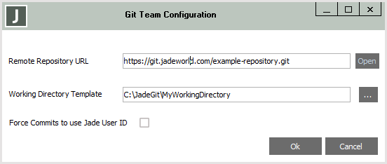 The Git Team Configuration dialog enables your team leader to configure options that will be used by your entire team for this Jade environment.