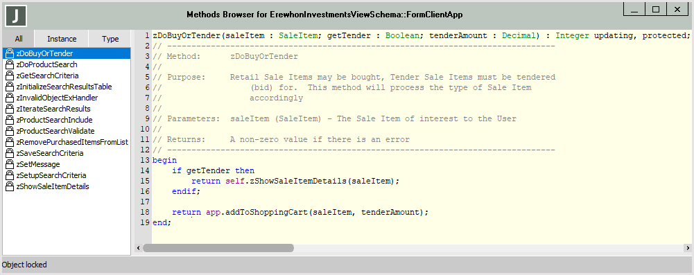 The logic for the selected method is then displayed in the pane on the right of the Methods Browser. You can select the Remove command from the Methods menu to remove a selected method from the class or you can select the References command or the Implementors command from the Methods menu to view the references or implementors of the selected method. (See also "Removing a Schema Element", in Chapter 3.)