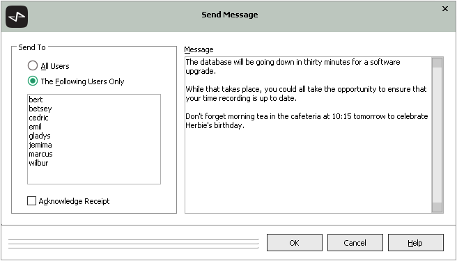 If the Acknowledge Receipt check box on the Send Message dialog was checked, a modal message box pops up on your workstation each time a recipient clicks the OK button. This message box displays the name of the recipient who acknowledged the message you sent. Click the OK button when you have read the name of the recipient who has viewed your message.
