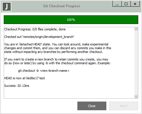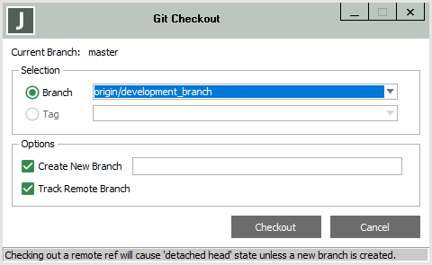 To perform the checkout operation, click the Checkout button. (Alternatively, click the Cancel button on the Git Checkout dialog, to abandon the checkout operation.)