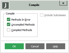 If the current class contains subclasses, check the Include Subclasses check box if you also want methods in subclasses compiled to your selected criteria. (As this does not apply to primitive types or interfaces, this check box is disabled when you access the dialog from the Compile command in the Types menu or Interfaces menu.)