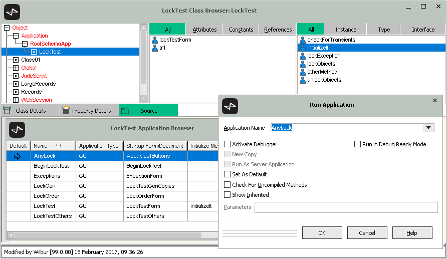 The LockTest schema shown in this example has user-defined applications, which in the development environment are persistent instances of the Application class. These user-defined applications inherit any constant, property, or method defined in the Application class or that you defined in the LockTest subclass.