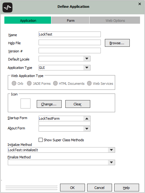9. In the Icon group box, click the Change button if you want to display the common File Open dialog, to enable you to select an icon (.ico) file for your Jade application icon display.