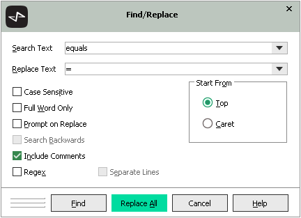 The Include Comments check box is set to true (that is, checked) for the first search performed after logging on. Subsequent displays of the local Find/Replace dialog set the check box value to the prior setting that was used to perform a search or replace action.
