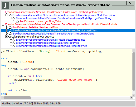When you have specified that you want to reuse the same form to display method source and you press F12 in the editor pane, Jade initially creates a new form to display the method source, and a list box that displays the history of how you got to that form. Each subsequent request to show another method uses the same window and adds the additional navigational history to the list box, as shown in the following example.