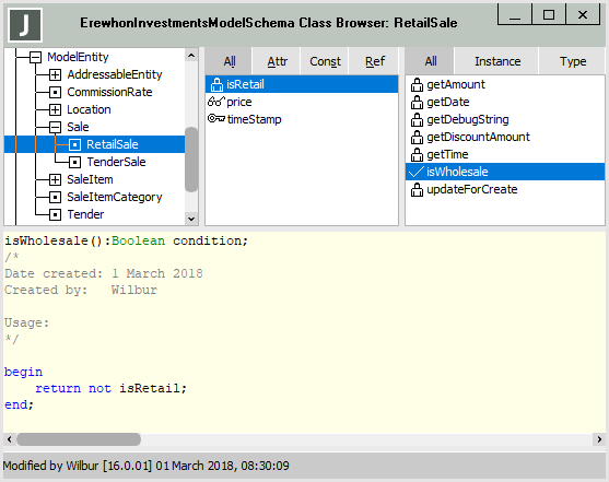 This syntax (with the exception of the optional parameters and constant-declarations) is automatically displayed with the return instruction in the editor pane when you click the OK button in the Add Condition dialog unless a method template is defined for your Jade Platform development environment, in which case the editor pane display is determined by the template.