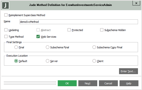 10. If you are defining a method for a subclass of the JadeWebService class or one of its subclasses, uncheck the Web Services check box if you do not want the method defined as a web services method. This check box is enabled only when a web services class is selected in the Class List and it is selected by default. When this check box is checked, the Web Services Options command in the Methods menu is enabled.