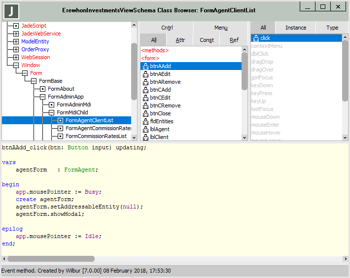 1. In the Properties list of the Class Browser window, click on the form or control for which the event method is to be defined. A list of valid events for the selected control is then displayed.