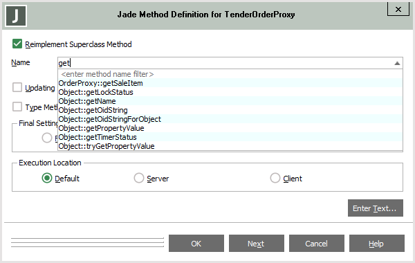 You can reimplement a method only if it is not final in the superclass. For details, see "final Option" under "Controlling the Use of Elements in Other Schemas", in Chapter 1. A drop‑down list containing all superclass methods that are not final is then displayed. Initially, all possible superclass methods are displayed. As the methods are listed by schema and prefixed with the class name, it can make selection of a method difficult.