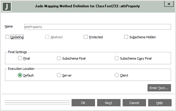 When you select the command, the Jade Mapping Method Definition dialog, shown in the following image, is then displayed, with the selected property displayed and disabled in the Name text box. In addition, the dialog title is displayed as Jade Mapping Method Definition For class‑name::property‑name.
