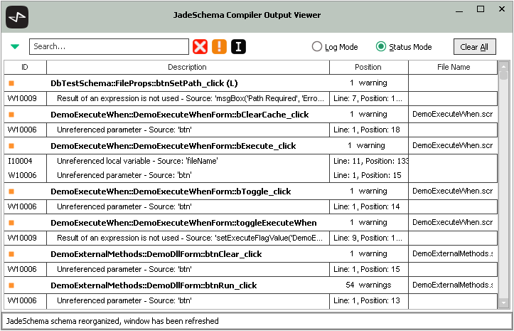The Compiler Output Viewer enables you to view error, warning, and information messages that occur when you compile schemas, classes, and methods in the Jade Platform development environment.