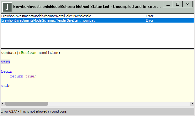 Alternatively, you can view code for a method that contains compilation errors by selecting a method in the Methods List whose compilation error icon to the left of the method indicates that it contains one or more compilation errors.