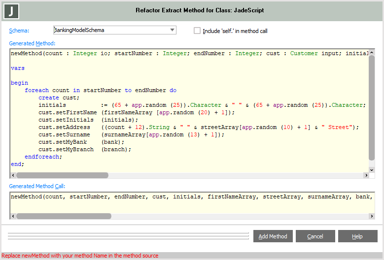 When you click the Add Method button, the new method is added to the currently selected class in the selected schema, using the method name specified in the Generated Method edit pane, and the selected content of the original source method is replaced with the contents of the Generated Method Call editor pane. This last change is not committed, so you can undo it by using the Ctrl+Z shortcut keys.