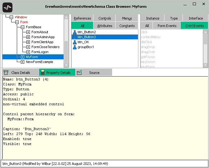 Now when you select your form in the Class List of the Class Browser, the controls listed in the Properties List display the prefixes that you defined for the controls in your schema.