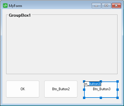 The following image is an example of a form containing a group box that has no defined prefix and three buttons that have a defined prefix. This illustrates that only the non-prefixed portion of the control name is automatically selected so that you can change it to a caption of your choice, if required.