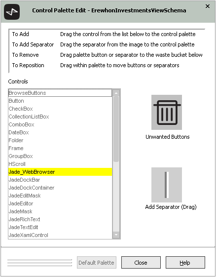 Any changes that you make to the palette, including adding separators, are stored in your user profile for the selected schema when you click the Close button on the Control Palette Edit dialog.