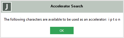 After selecting a control and clicking the Find Available Caption Accelerator Characters command, the Accelerator Search message box displays one of the following.