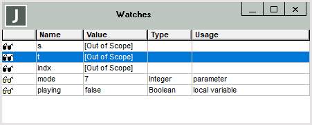 When the watch is active, if it is not valid in another context, the value is displayed as [Out of scope]. If the expression cannot be executed because a variable is null, **not Initialised** is displayed.