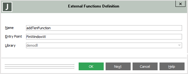 The External Functions Definition dialog, shown in the following image, is then displayed.