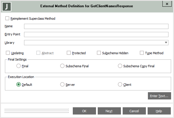 14. In the Execution Location group box, select the Server or Client option button if you want the serverExecution or clientExecution method option added to the signature of your external method so that the method and all methods subsequently called by this external method are executed on the server node or client node, respectively.