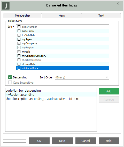 When you have defined the name and membership class of your new ad hoc index and clicked the Next button, the Keys sheet of the Define Ad Hoc Index dialog is displayed, to enable you to select the properties of that class to be used as keys in the index.