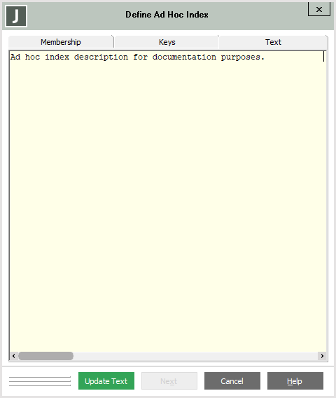 When you have defined the membership and keys of your ad hoc index and clicked the Next button, the Text sheet of the Define Ad Hoc Index dialog is displayed, to enable you to specify a textual description of the ad hoc index, if required.