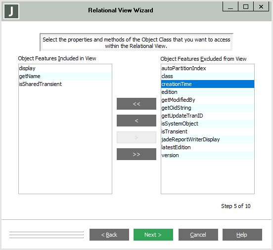 In the Object Features Excluded from View list box at the right of the Relational View Wizard, select the object feature you want to include in your relational view and then click the < button to move the selected feature to the Object Features Included in View list box at the left of the dialog. Alternatively, you can:
