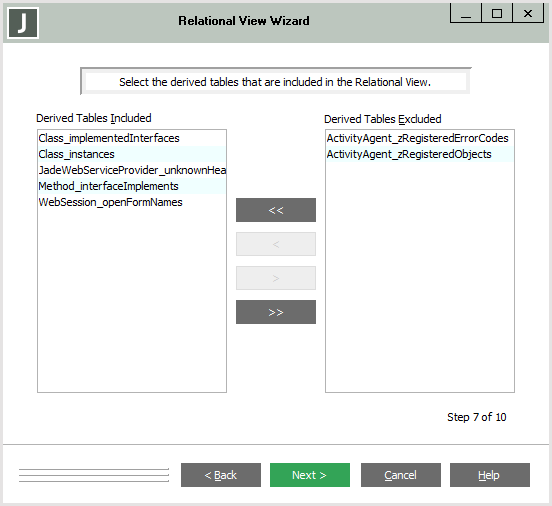 In the Derived Tables Excluded list box at the right of the Relational View Wizard, select the derived table you want to include in your relational view and then click the < button to move the selected table to the Derived Tables Included list box at the left of the dialog.
