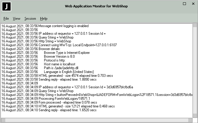 The Web Application Monitor window is a multiple-line text window that logs and displays web session information. Information is appended to the window display with each user request and new session interaction, as shown in the following image.