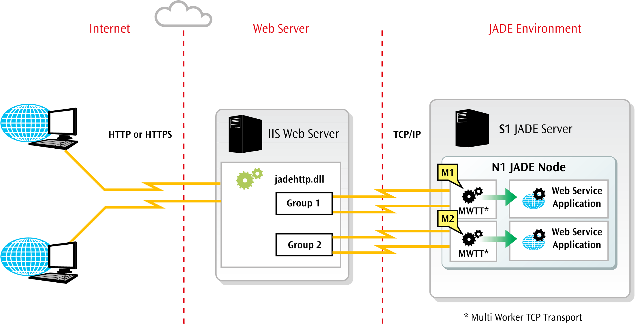 The configuration in this section is more likely when several unrelated web applications are exposed from the same database environment. In that case, the jadehttp.ini file will contain a separate section for each of the web applications rather than the dual group section shown in the example in the following subsection.