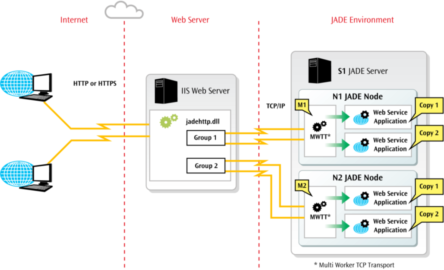 This image shows a configuration that splits the request processing workload between multiple copies of a web application running in separate Jade nodes within the same machine. This configuration has less resource contention than a configuration that has all web application copies running in the same node.