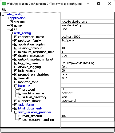 In the common File Open dialog that is then displayed, select the configuration file that you want to edit. The pane at the right of the Web Runtime Configurator window is then populated with the appropriate information, as shown in the example in the following image in which a file called C:\Temp\webappconfig.xml was selected.