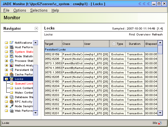 After the change to the application, the Monitor shows there were about the same number of locks and they were held for shorter periods. They were all held by the updating report, as before.